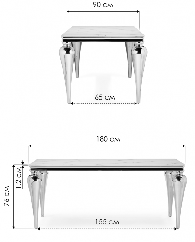 Толщина стекла: 1,2 см.  Расстояние между ножками: 155 х 65 см.