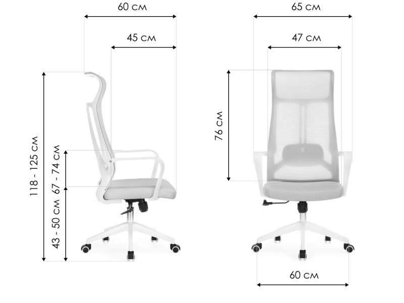 Высота подлокотников: 67 см. Диаметр крестовины: 60 см.